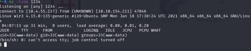 Use the python script to gain a shell: python3 -c ‘import pty; pty.spawn(“/bin/bash”)’