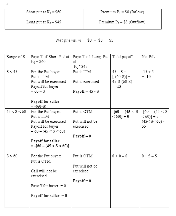 An investor writes a put option with exercise (strike) price of $60 and buys a put with exercise price of $45. The puts sell for $8 and $3 respectively. If the options are on the same stock with the same expiration date,