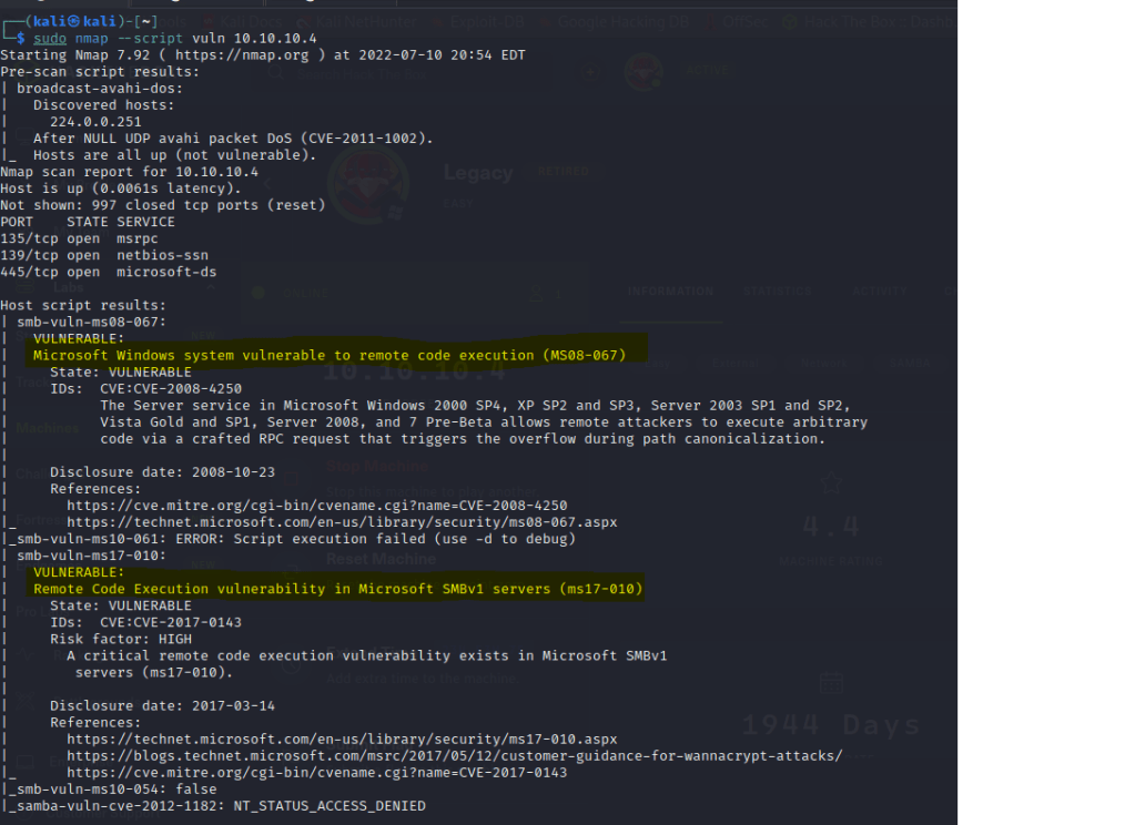 Run a nmap vuln script to find for known vulnerabilities since it is a legacy machine.