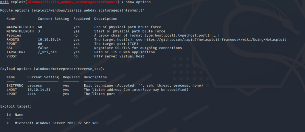 Set the TARGETURI option to /_vti_bin that was found on the dirb scan. And set the other necessary options and run the exploit.