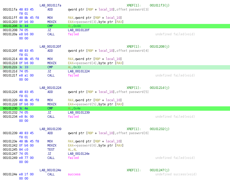 Code will compare each character in the password array and call the success function if all is true.