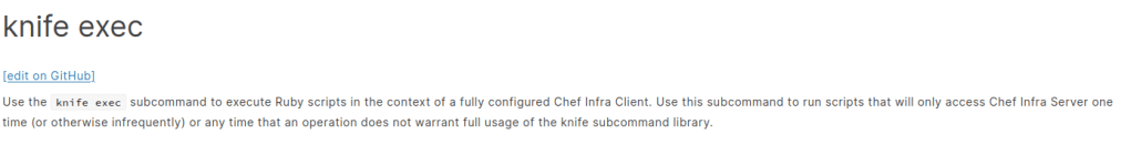 We need a sub command to run the knife function. There are multiple sub commands available and after googling, knife exec seems to have some potential.
