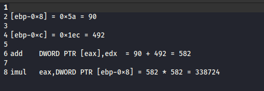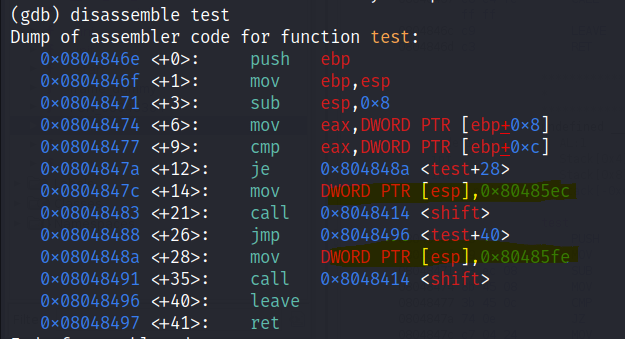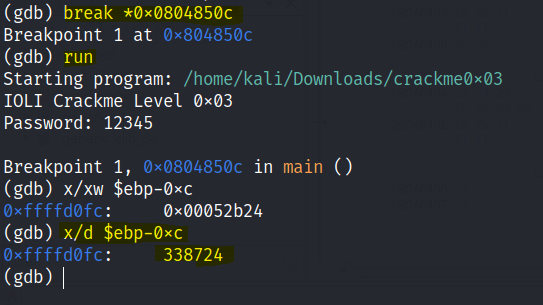 - Set a breakpoint at the test function and print out the variable for [ebp-0xc]