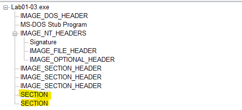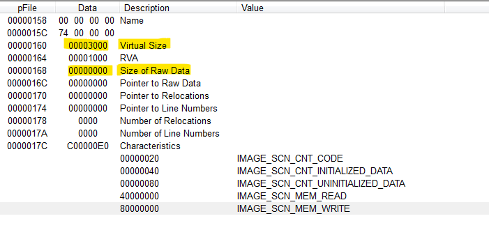The first section has a virtual size of 0x3000 but a raw data size of 0.