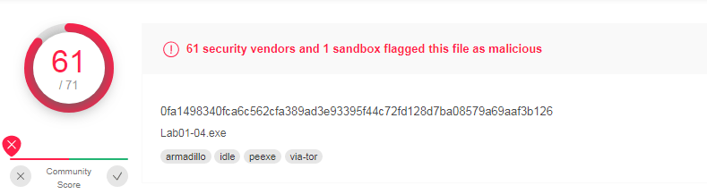 1. Upload the Lab01-04.exe file to http://www.VirusTotal.com/. Does it match any existing antivirus definitions?