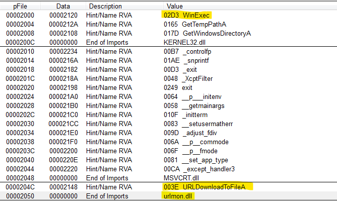 This exe access to the network functions. It calls URLDownloadToFile and WinExec that executes the file.