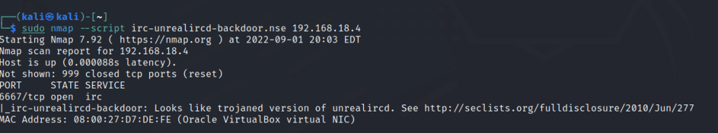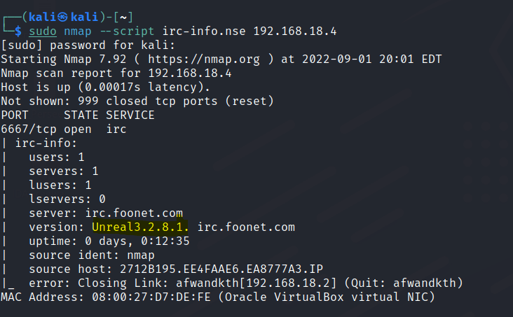 From the nmap scan and scripts results we notice the machine has a UNREAL IRC server.