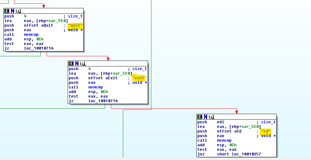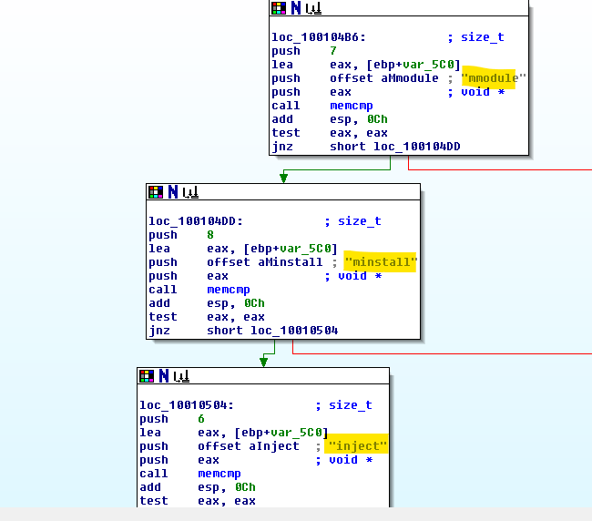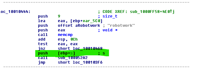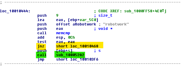 10.A few hundred lines into the subroutine at 0x1000FF58, a series of comparisons use memcmp to compare strings. What happens if the string comparison to robotwork is successful (when memcmp returns 0)?