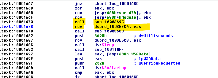 9.In the same area, at 0x100101C8, it looks like dword_1008E5C4 is a global variable that helps decide which path to take. How does the malware set dword_1008E5C4? (Hint: Use dword_1008E5C4’s cross-references.)