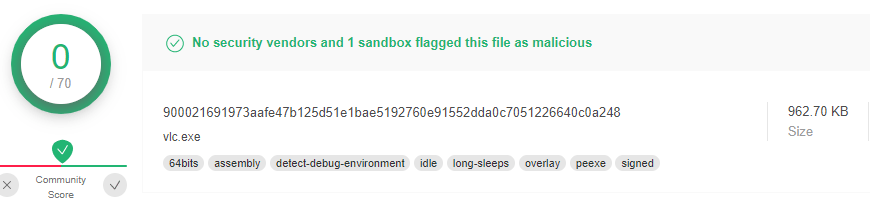 Does Virustotal report this MD5 Checksum / file vlc.exe as malicious? (Yay/Nay)