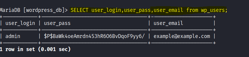 - Update the hash value of the admin with a new password hash to gain WP access