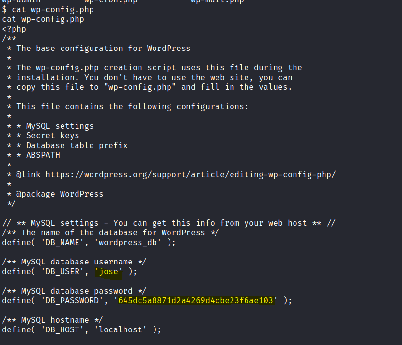 Found a WordPress config file with a user and db password.