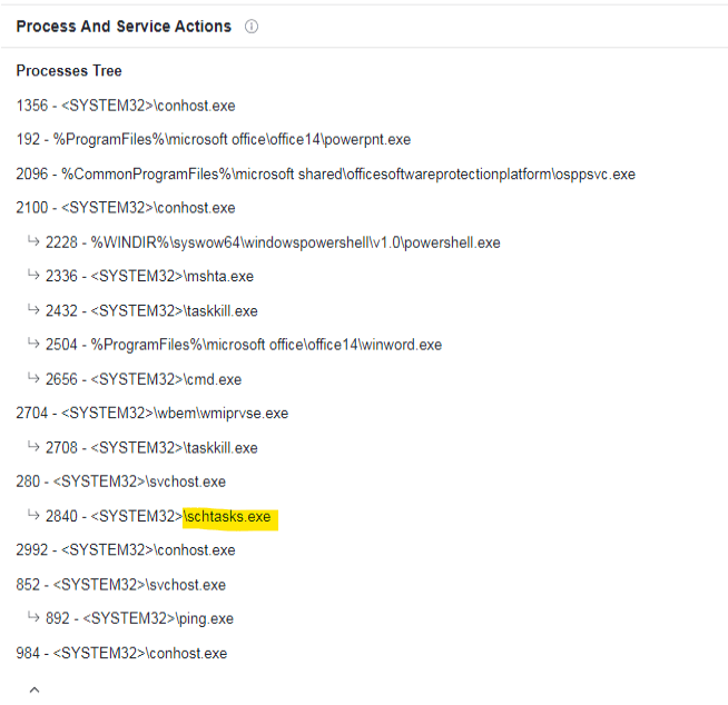 Which process is running to persistent under mshta.exe after the relevant malware runs?