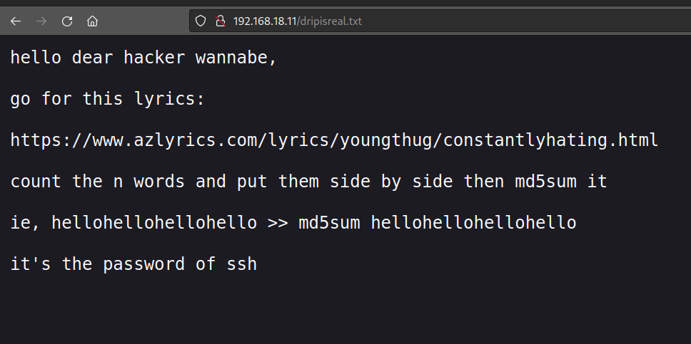 In the robots text file there is a hidden directory that looks like a command injection. Moreover the clue given seems we can search a drip folder. Lets use the index.php to set a command injection.