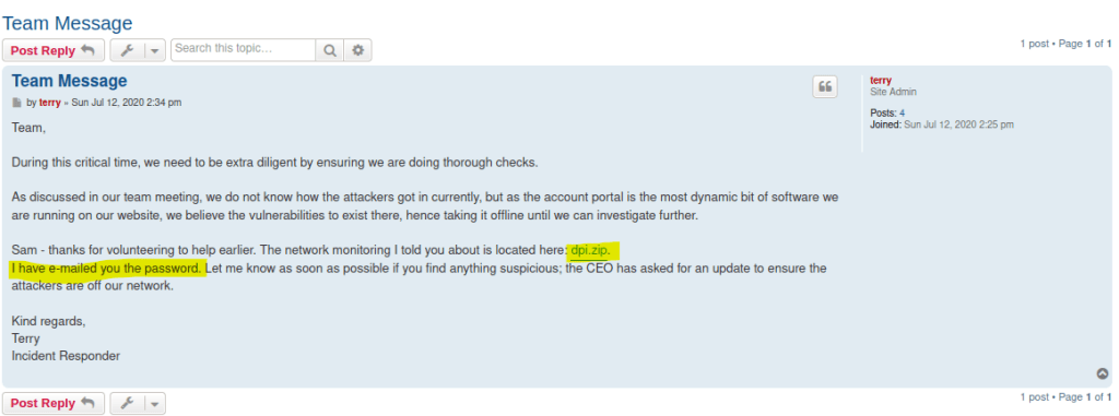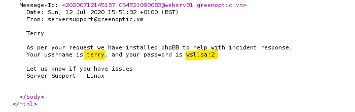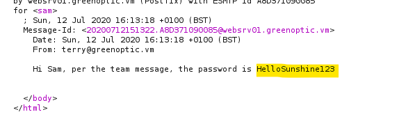 We found a clue from the user Terry indicating he emailed a password to Sam user that can be use for a zip file.