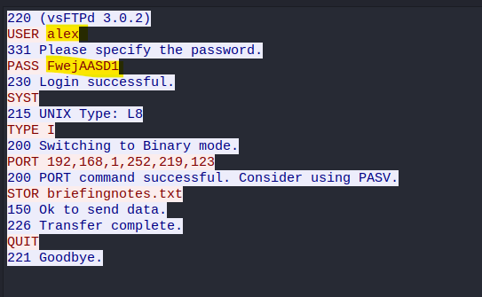 Once we unzip the file it contains a PCAP file which is a recorded network traffic by WireShark. Follow the TCP stream and we can find credentials for a FTP user.