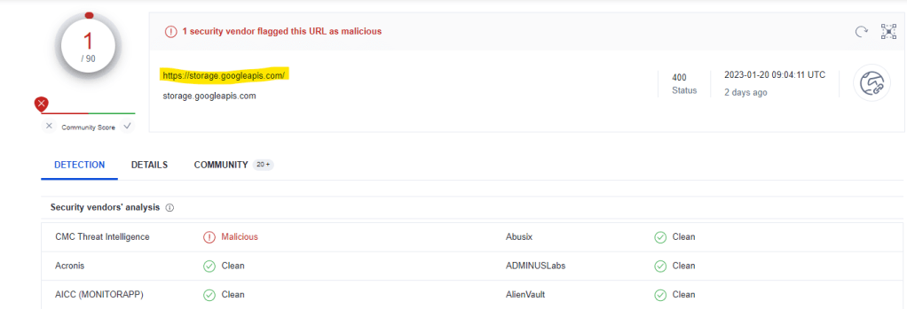 storage.googleapis.com is a legitimate domain however in VT comments, users identity this site as a potential phishing campaign. This could be known as Domain shadowing. Furthermore inputting the entire URL in VT indicates it is indeed a malicious link.