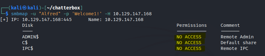 Tried to connect with the Alfred user on SMB but we don’t have permissions.