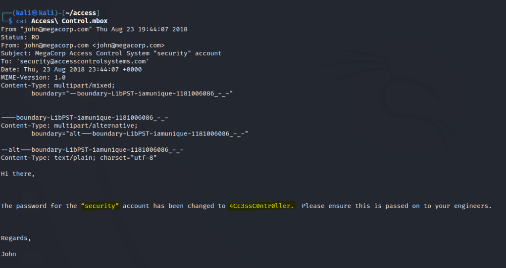 Use the readpst tool to read the email. We get some creds.