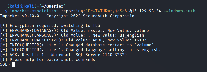 impacket-mssqlclient reporting:'PcwTWTHRwryjc$c6'@10.129.93.34 -windows-auth