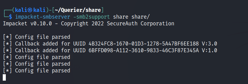 First we start the impacket SMBServer.