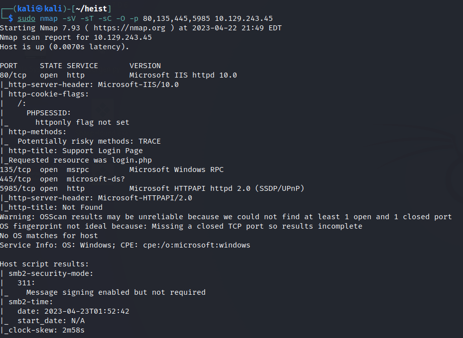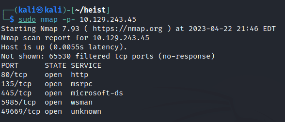 To begin our exploration of the network, let’s initiate an nmap scan in order to identify all open ports.