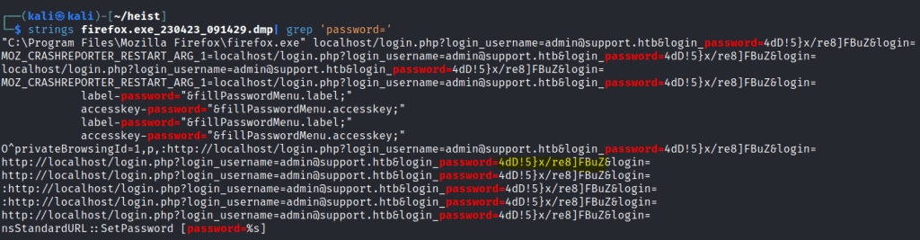 Transfer the file to your local machine and use strings with grep to find for passwords.