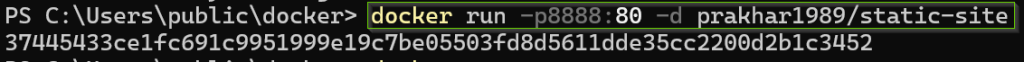 So, this command starts a detached container based on the “prakhar1989/static-site” image, mapping your local machine’s port 8888 to the container’s port 80 to access a web service provided by the container.