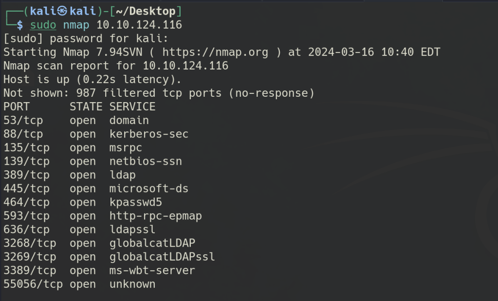 Start a nmap scan to look for open ports and add the necessary flags for in depth enumeration.