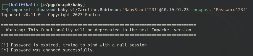 impacket-smbpasswd baby.vl/Caroline.Robinson:'BabyStart123!'@10.10.127.109 -newpass 'Password123!'