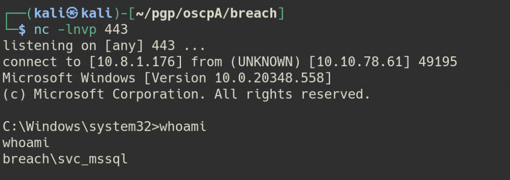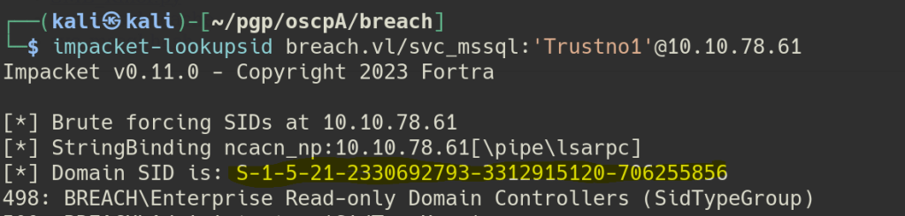 impacket-lookupsid breach.vl/svc_mssql:'Trustno1'@10.10.78.61