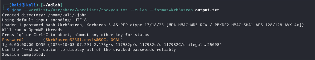 john --wordlist=/usr/share/wordlists/rockyou.txt --rules --format=krb5asrep hash.txt