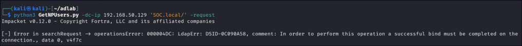 GetNPUsers.py -dc-ip 192.168.50.129 'SOC.local/' -request
