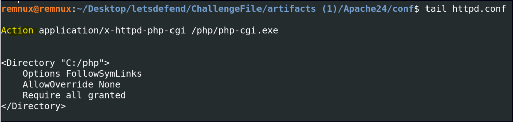 When PHP is configured to run as CGI, the Action directive in httpd.conf specifies the script handler for PHP files.