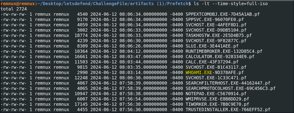 I couldn’t correlate the access logs and prefetch logs by date, but I found whoami.exe, a common tool used by intruders to check the accessed user. This is often a step taken after gaining access.