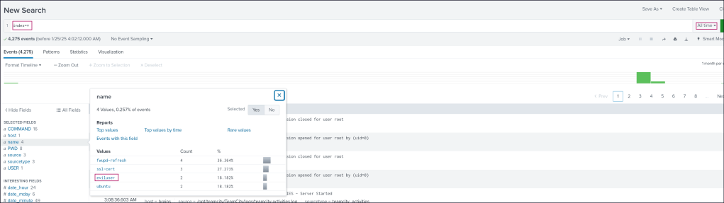Head over to the Splunk server and review the logs for all time periods. In the field section, there’s a field named name, where you can spot a suspicious user value.