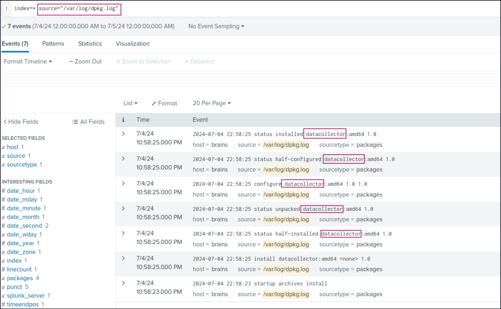 Among the logs, I noticed the dpkg.log source (which records package installation and removal activities on Debian-based systems). Here, I identified a potentially malicious package name, along with its version, which raised further suspicions.