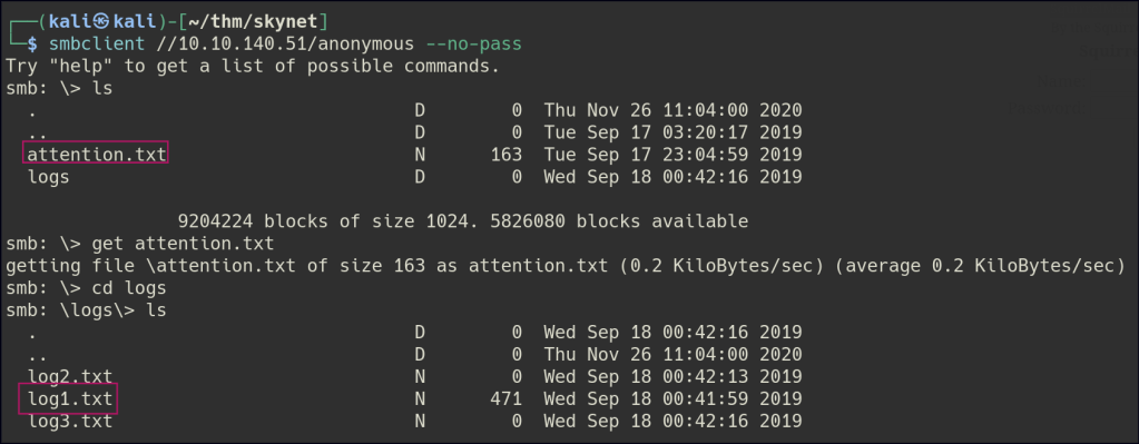 There is anonymous file share, and we are able to retrieve some files. The attention file is indicating that passwords has been exposed and the log1.txt seems to be some kind of password list.