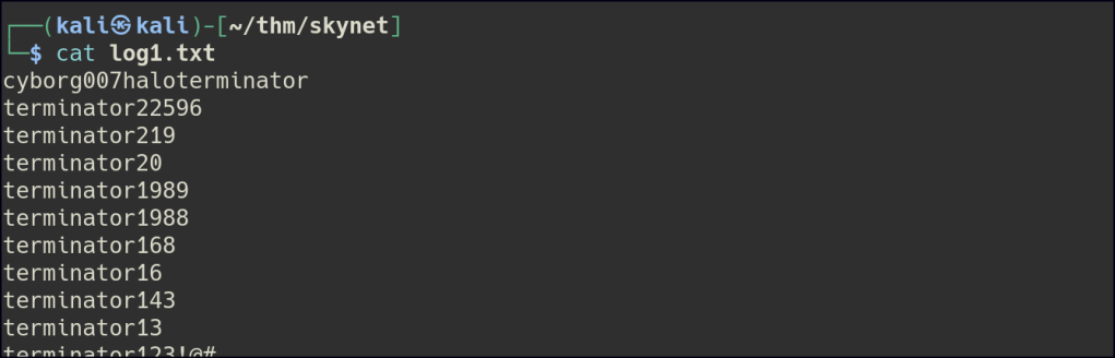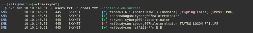 Since we know the username format of a user (milesdyson), we can try to password spray the account with log1.txt.